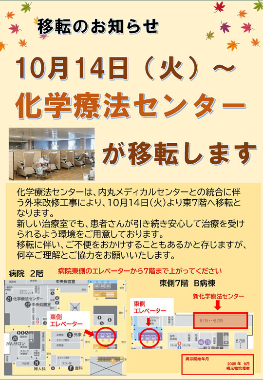 このたび、化学療法センター、がん患者・家族サロンは、内丸メディカルセンターとの統合に伴う外来改修工事により、令和7年10月14日(火)より東7階病棟へ移転いたします。