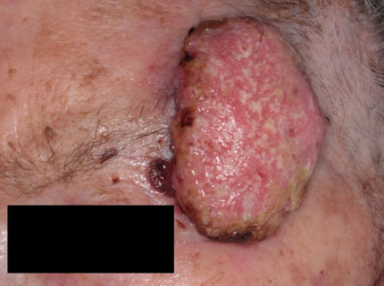 代表的な皮膚がんのうち最も多くみられる基底細胞がんは高齢者の顔面に好発します。黒色調を呈することが多く、潰瘍がみられることもあります。転移することはまれですが、進行すると骨などの深部組織に及びます(図1)。有棘細胞がんは顔面や手背などの日光露光部に好発しますが、やけどや外傷の痕などからも生じます。いびつな紅色の腫瘍としてみられ、表面はびらんとなるため出血や悪臭を伴います(図2)。