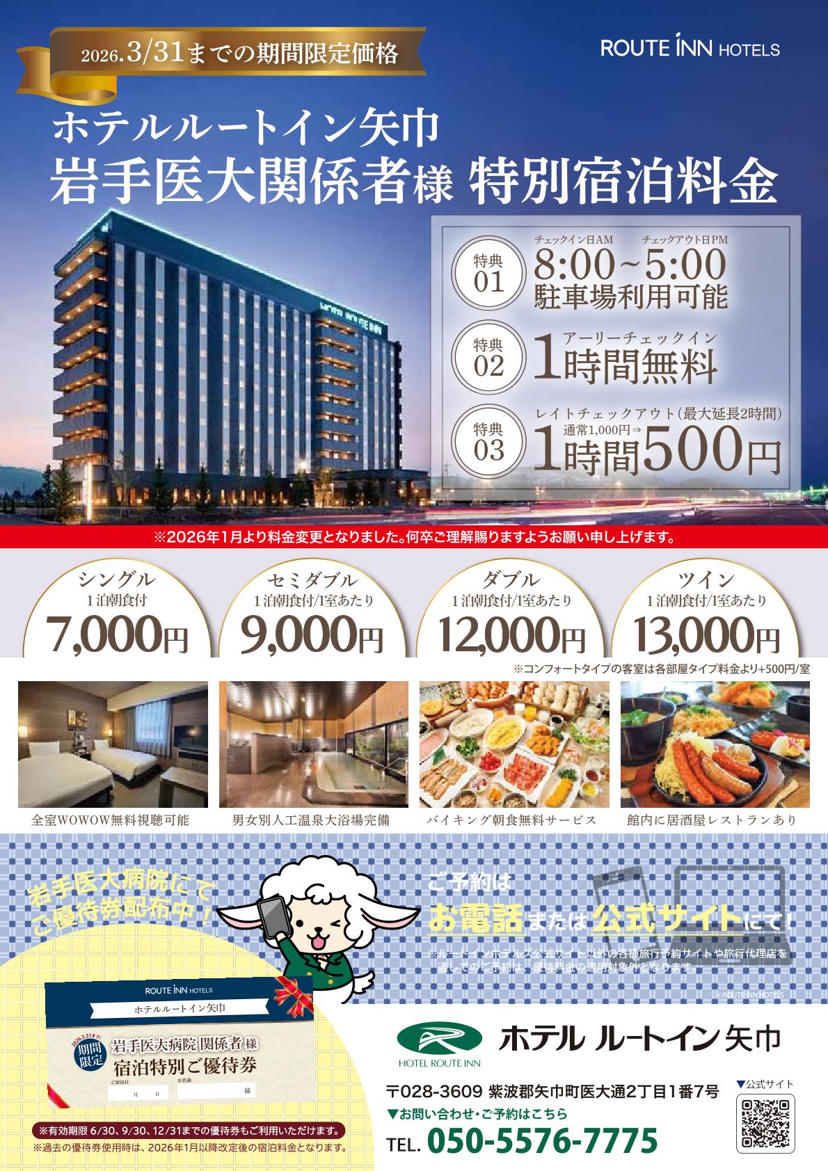 2026.01.13 ホテルルートイン矢巾-岩手医大病院-の宿泊優待について ホテルルートイン矢巾-岩手医大病院-では、当院の患者さんとそのご家族、また来院される関係者に対し、宿泊優待券を発行いたします。 配布場所は以下のとおりです。 ・矢巾附属病院:総合案内、患者サポートセンター、防災センター ・内丸メディカルセンター:総合案内、患者サポートセンター 宿泊に関するお問い合わせ・ご予約は、直接ホテルルートイン矢巾-岩手医大病院-【TEL:050-5576-7775】にお願いいたします。